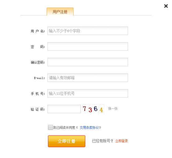 填写用户名、密码、邮箱地址、手机号,验证码等个人信息,并点“同意一下条款,提交注册”按钮完成注册。